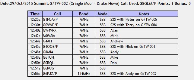 Thanks to those chasers who managed to scrape my signal out of the noise. We had “less than ideal” conditions with winds so strong that you could hardly stand up, constant rain and very reduced visibility. When we managed to get to the summit and get set up my vertical trapped antenna refused to tune to a reasonable VSWR, possibly due to the constant rain running down it. The fact that it blew down a few times also did not help either! That we managed to accrue the number of contacts that we did on G/TW-002 was amazing! Unfortunately in the conditions I was not able to let Jim get onto the station as he was helping keep the antenna vertical and doing some of the log keeping in the very quickly well sodden log book.