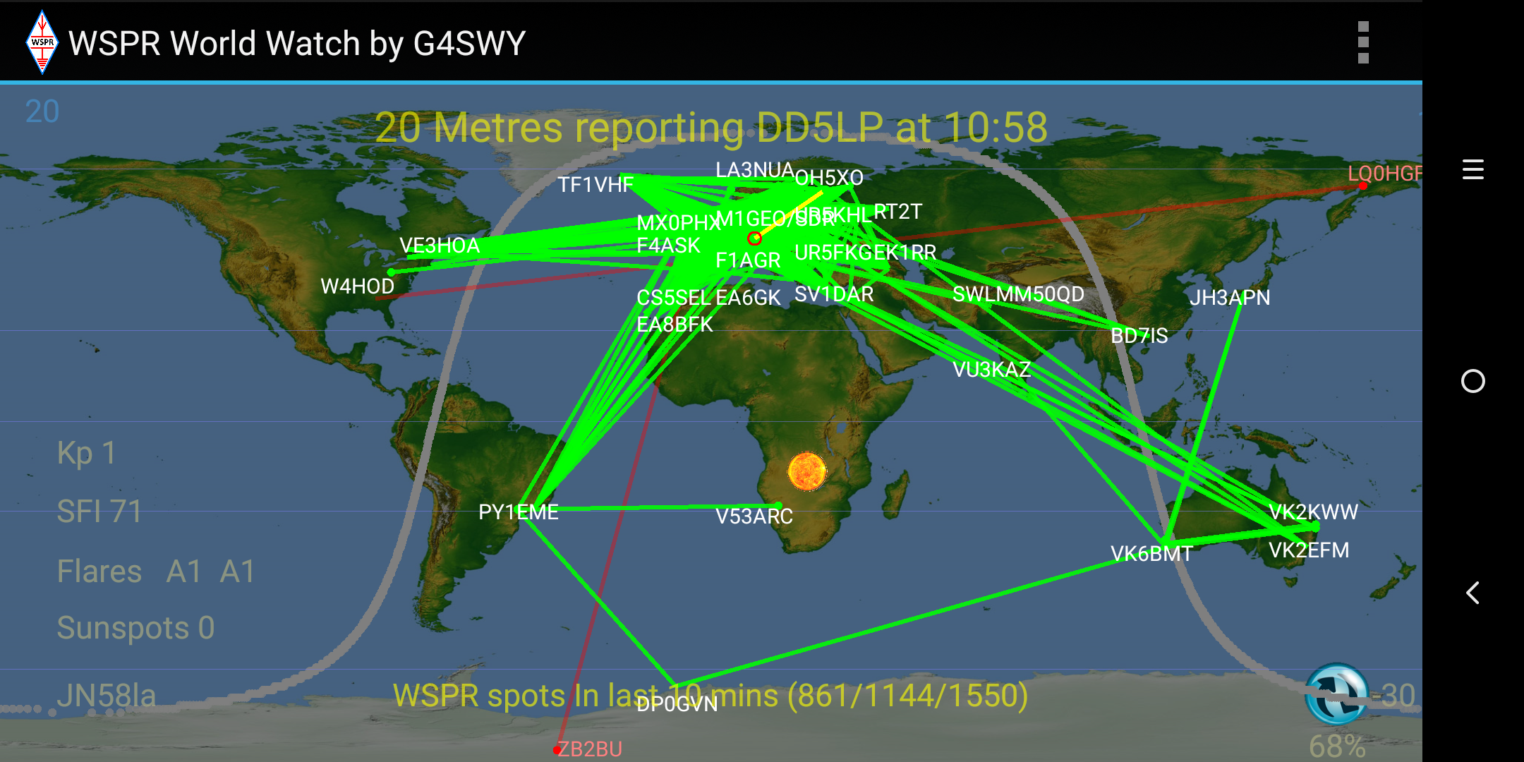 Screenshot_2019-02-15-11-58-56-1806683716 Published 17/02/2019 at 2160 × 1080 in DD5LP/P – February 15th 2019 – DL/AL-179 Weichberg. WSPR indication of 20m propagation.