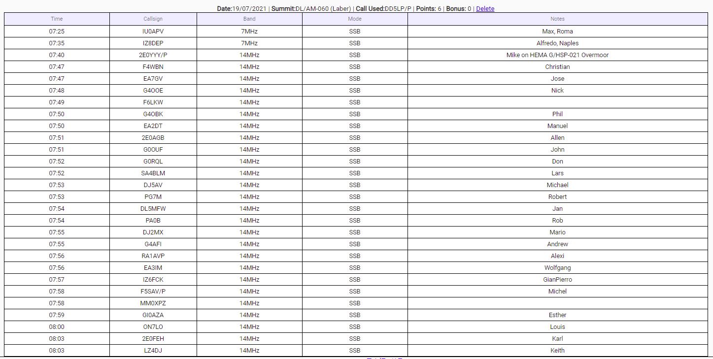 I have activated Laber so many times, that I know exactly where I will go and what I can set up. In about 15 minutes, I had the station installed and wanted to check who else was out via the SOTA Spotter App but it didn’t seem to be updating, so I switched from the Vodafone to the Telekom network (I have a dual SIM phone) and at that point, I received an email from Ernie VK3DET telling me on which frequency Mike 2E0YYY/P was on – we usually try for contacts between Germany, England and Australia but it was quickly obvious that the conditions to get through to Australia had already closed. I would have needed to have been on the summit an hour earlier at least. As I had set up for 40 metres and Mike was already on 20m, I took a quick tune around and worked two very strong Italian stations and then tried to spot myself. I couldn’t as there was no Internet connectivity again – this was going to be the story of the day – but more of that later. I then changed the setting on the bottom of the HF-PRO-2 vertical for 20m and went to see if I could hear Mike. There was nothing on the frequency that Ernie had given me, so I put a quick call out for Mike. “BOOM” back he came with a fully quieting S9+ signal. The conditions within Europe at least were very good on 20m. Mike had worked a station in St Helena some minutes earlier who had commented that the band was not good.