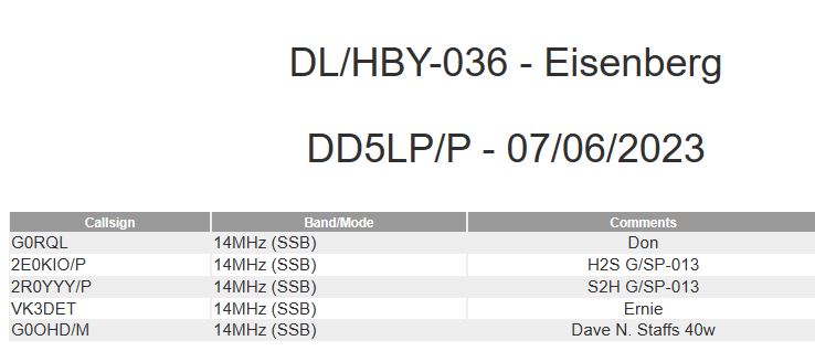 That was 5 contacts in the log and enough to Qualify the HEMA summit DL/HBY-036, so now I spotted myself on SOTA and started calling CQ SOTA. As always there are a lot more SOTA than HEMA chasers and I soon got to better than one contact per minute, even with my “chatty style”. After “draining” the 20-metre callers, I switched the antenna and radio to 40-metres for a lot more chasers. When this flood calmed down, I looked at my watch to see it was just coming up to 10 am local time and the restaurant where I had parked my car would just be opening up, so it was time to pack up, head back down and then pop into the restaurant garden for a leisurely Weissbier before setting off home. The ideal way to end a successful activation.