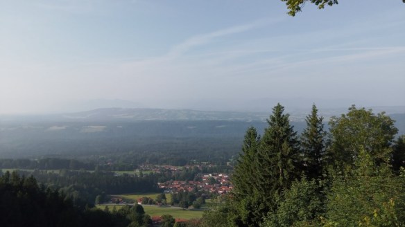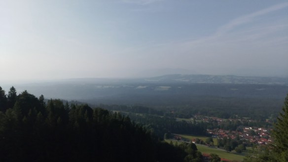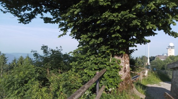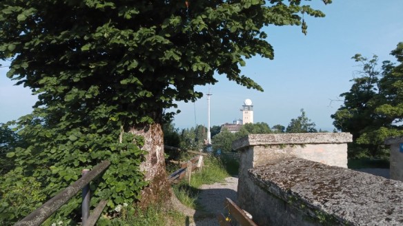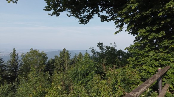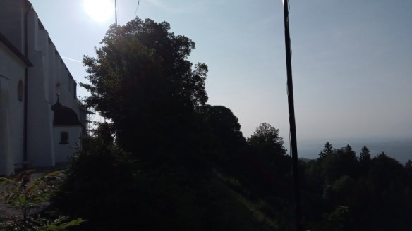 I could probably drive the route to this summit with my eyes closed, and on some previous winter mornings in thick freezing fog, I had in fact effectively done that. This time, however, the weather was kind (if still cold) and the trip took around 45 minutes. After buying a 3-hour ticket (€2) for the car park (it used to be free, but like many well-visited locations, someone decided they could make more money out of tourists). I headed up to my favourite seat alongside the church, looking out over the valley, on a very misty morning.