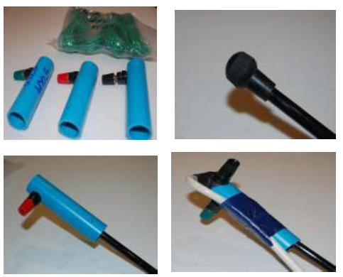 In all tests up until now, I have simply taped the coax connection point plastic tube (and now the “element” connectors) to the top of each squid pole. This is fine for a temporary set-up but the tape dries up and they simply don’t look good. So I have now filed down the rubber balls on the top of the squid poles, so that they can go inside the plastic tubes (stopping going through when they hit the screw at the back of the screw terminal). In the case of the co-ax connection point this meant I had to move the coax so that it came out of the top of the tube instead of the bottom.