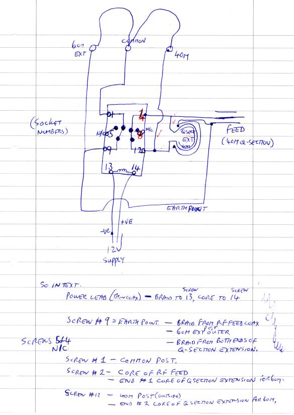 So now a simpler design was needed – Just to switch out the extension when I wanted to use the existing 40m loop (on 40m and 20m). BUT WAIT…. the design above also used a 3:1 Balun (which if you read the article on the 40m loop you’ll see I tried out). I find however that the Q-Section (a length og 75 ohm coax of a specific length) actually allows the antenna to work better than with a Balun which in the case of the loop appears to increase the base noise level. So leaving the cut for 40m Q-section in place while working (sort-of) only allows an SWR of just under 2:1 on 60m, whereas it gives a 1.1:1 SWR on 40 metres – so a 60m Q-section when operating on 60m makes good sense, but again would require some kind of switching. the solution I decided on for this is to have an extension to the 40m Q-section that is in circuit when the antenna is switched to 60m and shorted out when the antenna is operating on 40m (the same approach as with the normal and extension loops). So I either need two change over relays or ideally a DPDT relay that would be wired so that the 60m loop extension and q-section extension are shorted out when there is no power on the relay and 12v is applied to the relay when operation on the 60m antenna is required – here is that circuit: