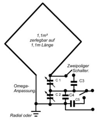 In search of the optimal loop, 10 loop arrangements with different conductors and matching circuits were examined. The square loop with square conductor cross-section proved to be the best, in asymmetrical operation and with omega adjustment. For high efficiency, it uses a strong coupling of the TX lead to the low-loss loop. With inductive coupling, no strong coupling was possible, which is reflected in a high load. This in turn creates a high voltage and current thereby making the variable capacitor significantly more expensive. An asymmetric loop is more than 3 dB better than a symmetrical Loop because the asymmetrical loop works against the earth and/or radials. The symmetrical loop radiates in a no-earthed environment, the so-called HF-Swamp. A lot of energy in the near field is absorbed or wasted. In the near field of the loop, there is a high reactive power, however, which causes active power losses in distributed earth systems. The individual capacitors form an omega match for the relevant bands. For the 20m band, only the rotary capacitors C1 (tuning) and C2 (adjustment) work in series (see Fig.4.) On the 80m band C3 (bandspread) and C5 will be switched in. On the 40m band C4 must be switched in. For 10 + 15m band operation the loop circumference must be reduced to 3.28m using the sliding shorting bar. This arrangement is very effective. DL4 KCJ May 2012