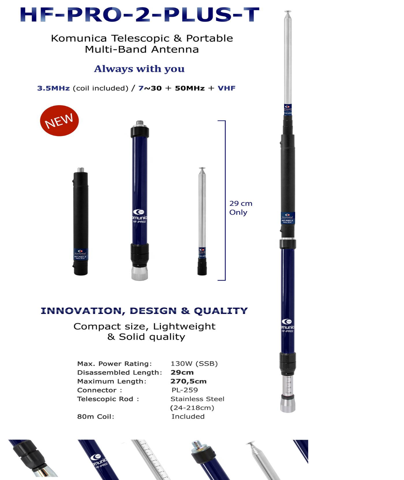 Some of you may have heard of the basic HF-PRO-2 model which I have used for a couple of years. This new “-PLUS-T” model has the solid radiating element replaced with a telescopic one. This improves on our points 1 & 6.