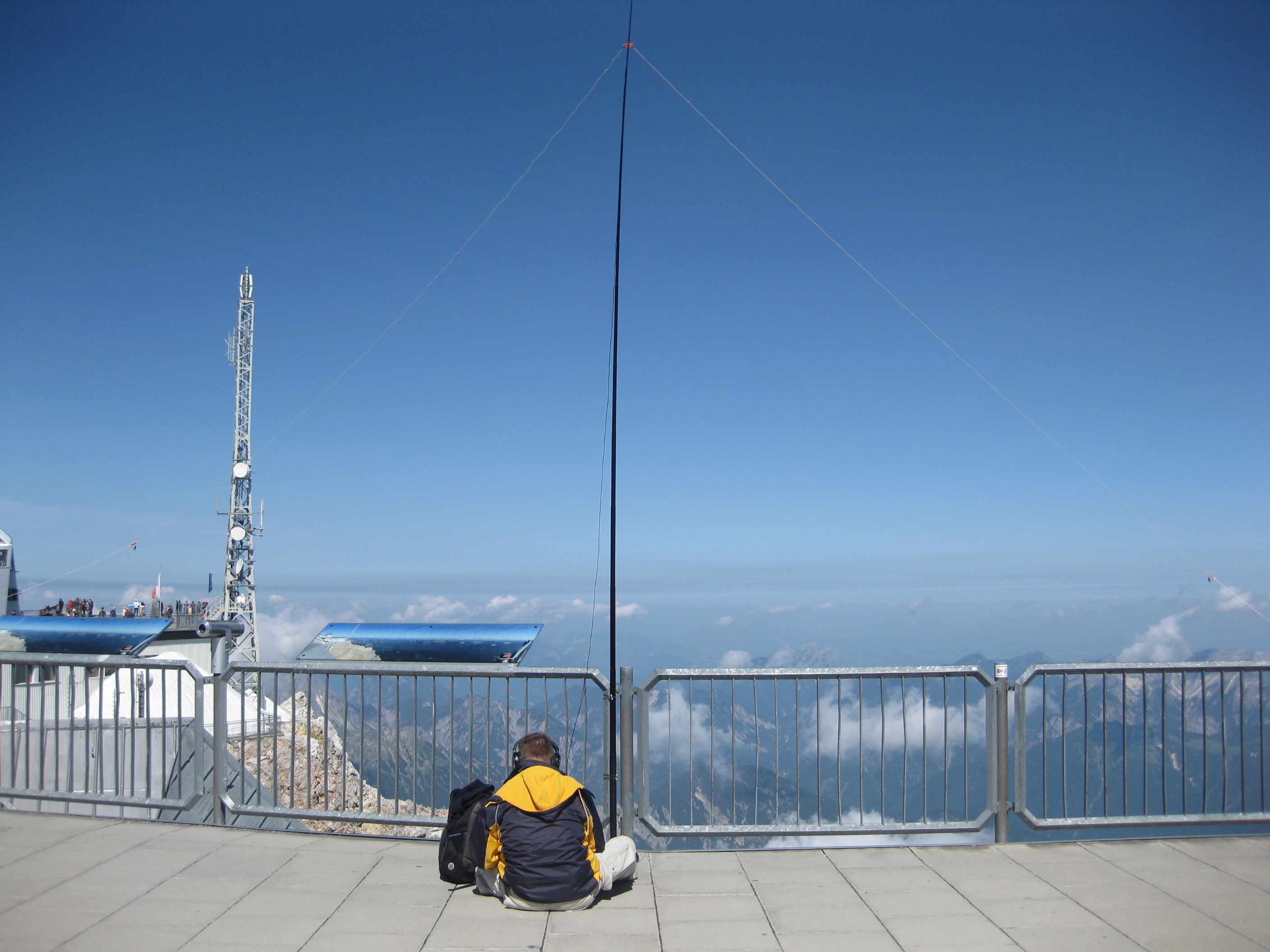 I operated from the viewing platform nearest the actual summit (on the German side of the border). Even though it was early there were already a lot of people around so I needed to take my spot quickly. Some of the railings are slanted so these are no good for fastening the ‘sqid pole’ (aka fishing pole) to. Luckily I found some vertical railing and with the help of my wife and her friend (both of whom had never been on the Zugspitze before and totally enjoyed the day) I managed to erect the antenna quickly between gusts of cold wind (temperature on the Zugspitze during my visit was 2 degrees Celsius).