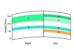 Although time of day is just one of many variables, here is a simplified model of the ionosphere: