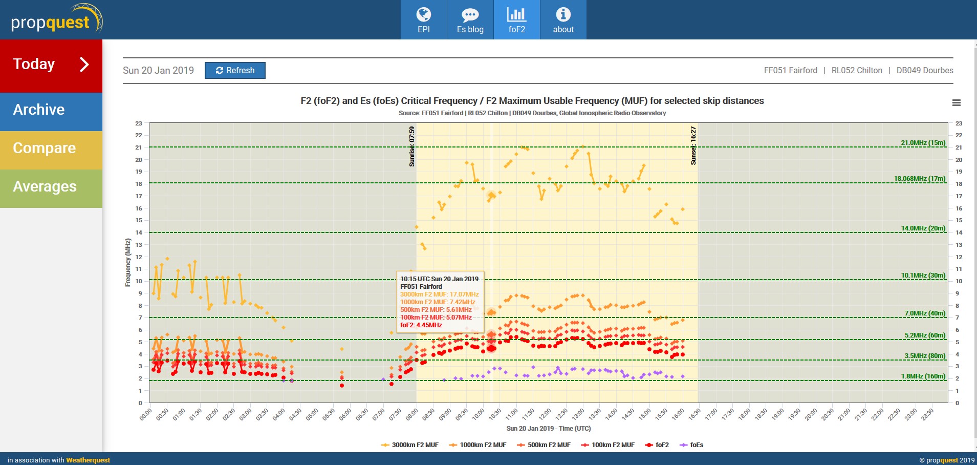 So, what is possible? Well without tens of thousands of dollars of equipment you can’t do anything yourself however there are publicly run Ionosondes (Ionosphere sounding) stations around the world and their data can help. In Western Europe we are lucky to have an amateur run website that takes the data from three western Europe Ionosondes and present the data on the web. This website is called PropQuest and can be found at: http://www.propquest.co.uk/graphs.php. For those living in other parts of the world, you will need to find a local equivalent.