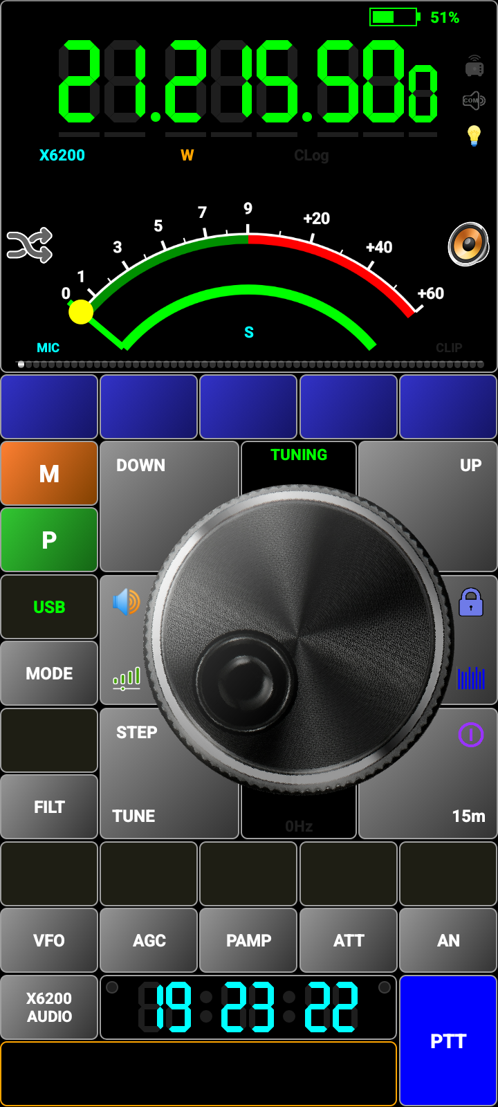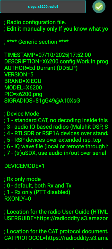 The response time of commands is sub-1-second as TCP is used rather than UDP. The result is a smooth operation of the radio “from afar”. Given the fact that the X6200 uses Linux internally, it may even be possible to operate the Linux pRxTxSRVR package from within the radio (this has to be tested), meaning the need for a Windows PC could be removed. As it is, in this version of the program, a second Smartphone can already perform the same role as the Windows PC. Being such a small radio, this brings other ideas – if a sealed, waterproofed box with a 12v supply was available at the top of a tower or on the roof of a high building, it would be possible to have the radio + Smartphone-server in the box and operate with a very short cable to the antenna with access to operate from anywhere over the Internet (security is handled via a server password and knowing the ISP’s allocated IP address and port number in use (which is a free choice of the person installing the solution).