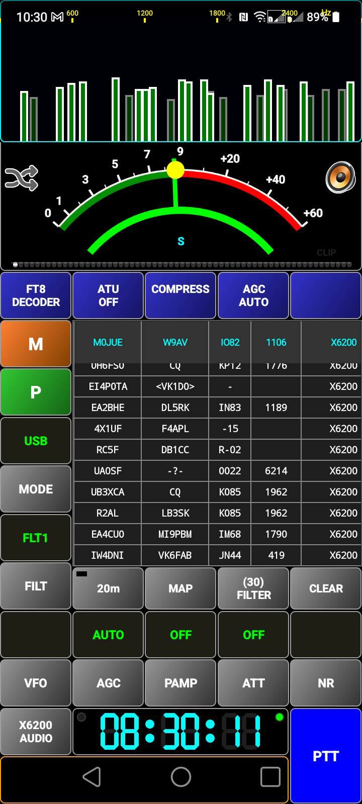 11. CAT commands from the Android app (e.g. tune receiver up 1 kHz) are sent to the X6200, and a response is sent back to the Android App to say the command has been completed. At the same time, an audio link is in place so that the audio from the X6200 transceiver is heard through the Android phone’s loudspeaker or headset. Once the PTT button in the smartphone app is pressed, the radio is put into transmit mode and audio from the smartphone’s microphone or headset is sent to the X6200 via this route and then transmitted out to the radio’s antenna …. from here you are at the mercy of the radio propagation conditions ….