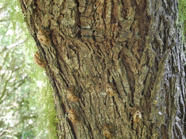 Although not listed with this name in the SOTA database at present VK2/CT-043 is in fact Mt Tomah. Public access is easy by taking Rainbow Ravine and then Charleys Road from the main “Bells line of road”. Access is not possible any other way as the grounds around the summit are private. Car parking is at the actual summit. So a walk away from and back to the summit was executed. This serves a dual purpose. As well as being “in-the-spirit” of SOTA, it also gives the opportunity to see if there was a better location to set-up the station and look for a Trig point (there is none). Near to the summit there is a large high power microwave relay station, which I suspect accounted for my S3-4 noise level. Having checked out other roadside locations, which were too close to private homes, I returned to the summit and headed down away from where the car was parked into some open grassland and used one of the pairs of locked gates to fasten my squid pole to for the linked dipole antenna. I found an interesting sight on one of the trees nearby – it looked like some creatures had simply exploded from their skins and left the skins, legs and all on the bark of a tree.